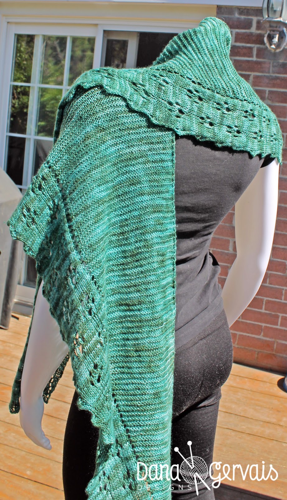 The shawl is knit side to side with the body of the shawl and lace border worked simultaneously. All increases and decreases are worked in the garter stitch body of the shawl.